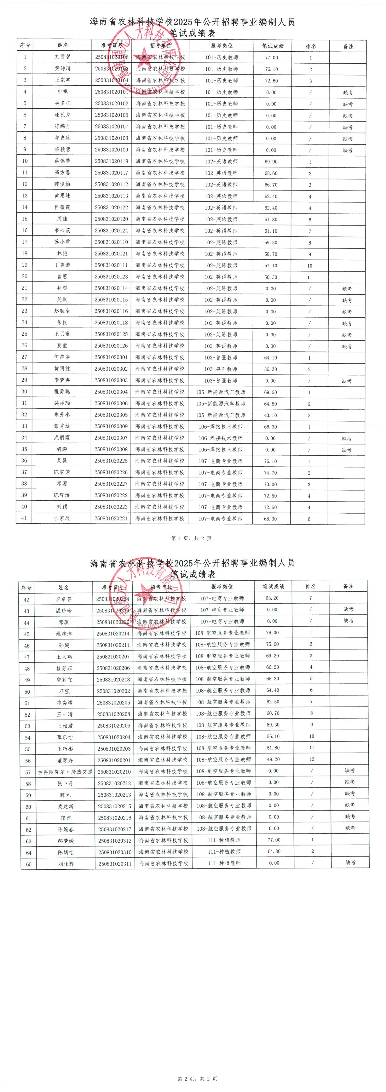??一、笔试成绩单(详见附件.海南省农林科技学校2025年公开招聘事业编制人员笔试成绩)