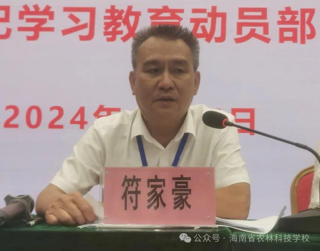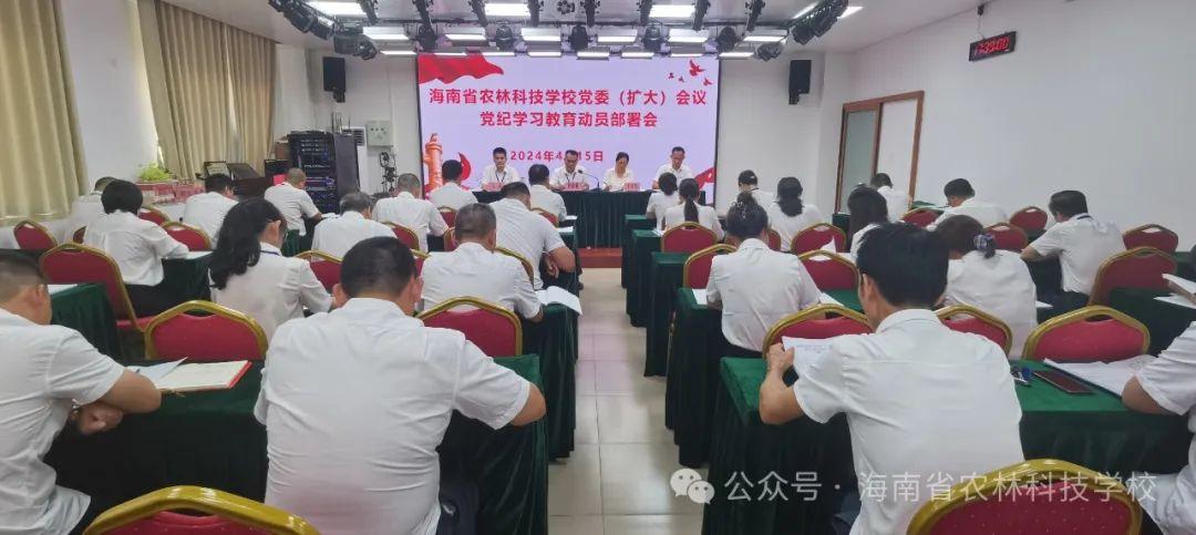 4月15日下午,海南省农林科技学校党委(扩大)会议在综合楼五楼会议室召开,会议传达学习习近平总书记关于党纪学习教育的重要讲话和重要指示精神、中央党的建设工作领导小组会议精神、省委常委会会议暨省委党的建设工作领导小组会议精神和省委教育工委有关部署,启动部署学校党委开展党纪学习教育工作。学校党委书记符家豪主持会议并讲话,学校党委班子成员,全体党员参加会议。