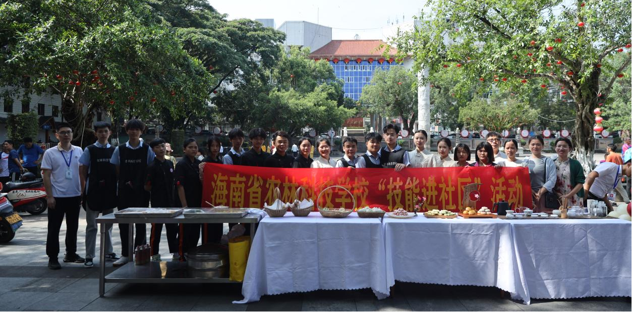 我校在五指山市三月三广场开展2024年海南省职业教育活动周——“技能进社区”活动,包括茶艺、形象设计、中式面点等专业技能展示。