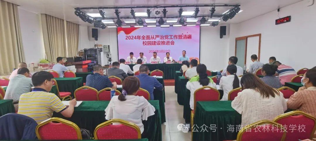 3月22日下午,海南省农林科技学校党委召开2024年全面从严治党工作暨清廉校园建设推进会,会议深入学习贯彻习近平总书记关于党的自我革命的重要思想,贯彻落实中央纪委三次全会、省纪委八届三次全会和教育部及全省教育系统2024年全面从严治党工作暨清廉校园建设推进会议精神,回顾总结2023年学校全面从严治党工作,部署安排2024年工作。学校党委书记符家豪出席会议并作总结讲话。学校中层及以上干部、全体党员,财务人员参加会议,会议由党委委员郑学盛主持。