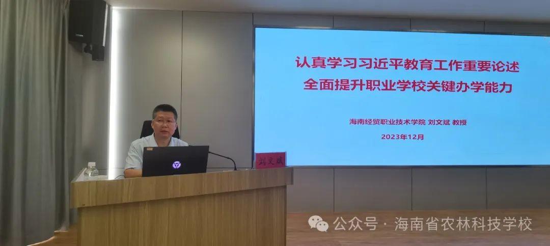 专题教学由海南经贸职业技术学院党委委员、副院长刘文斌教授作了题为《认真学习习近平总书记关于教育工作的重要论述?全面提升职业学校关键办学能力》的专题授课。