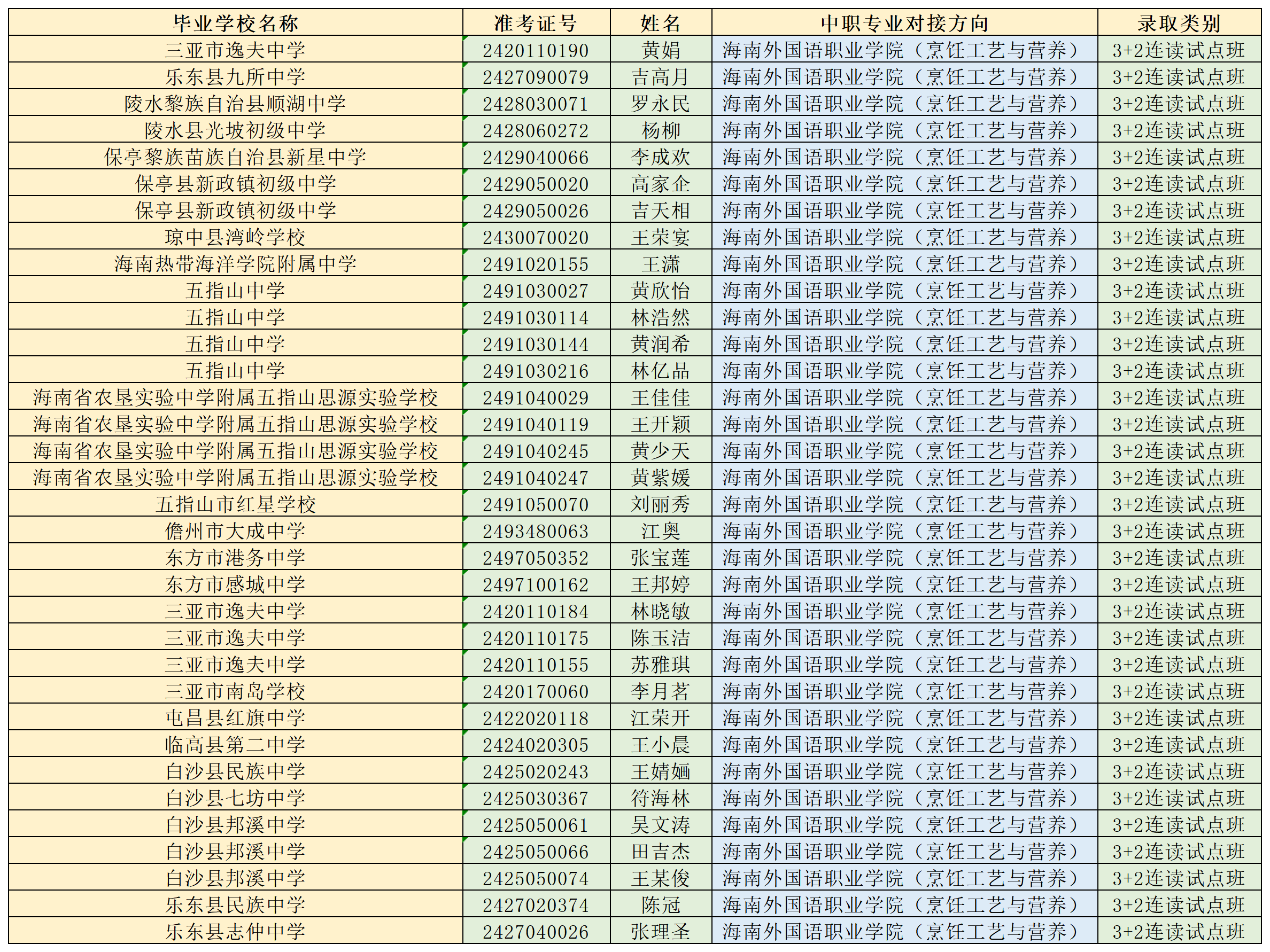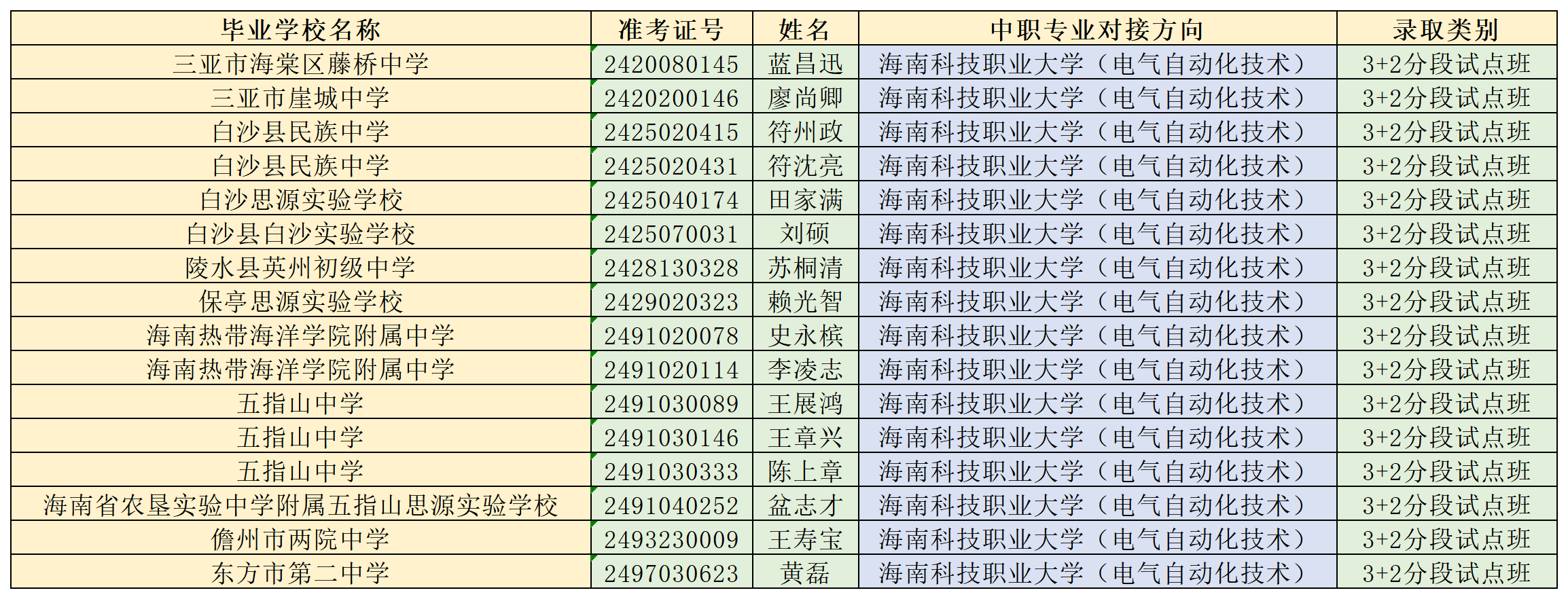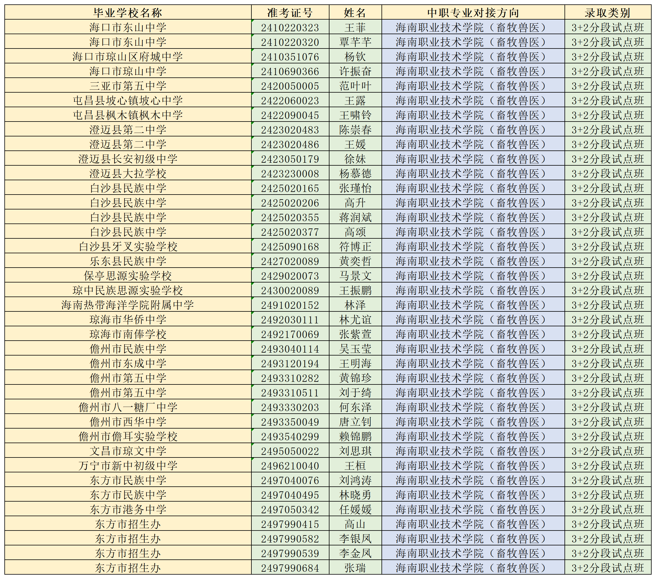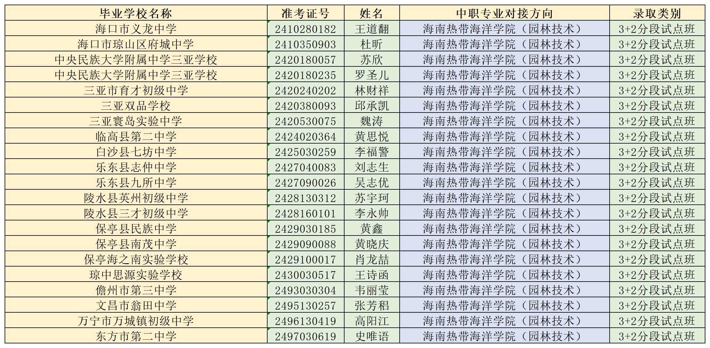 海南省农林科技学校2024年“3+2”连续、分段贯通培养项目各专业录取名单公告